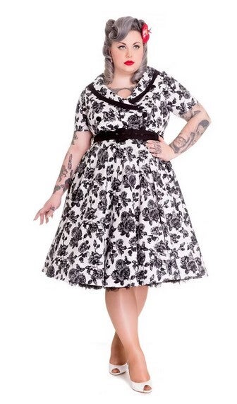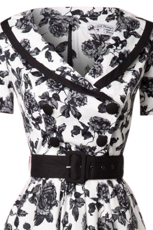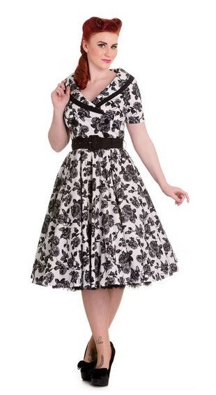 50er Jahre Rockabilly Kleid in Weiß mit Rosenmuster in Grau & Schwarz.