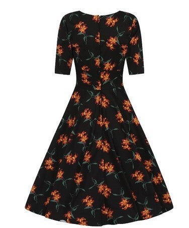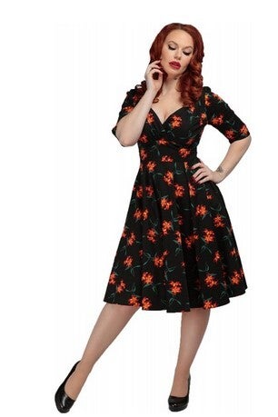 Das an den Stil der 50er Jahre angelehntes Trixie Midnight Lily Kleid von Collectif aus schwarzem Baumwollmaterial mit kontrastierenden Lilien und Blättern als Muster- gibt einen vielseitigen Look für Tag und Abend!