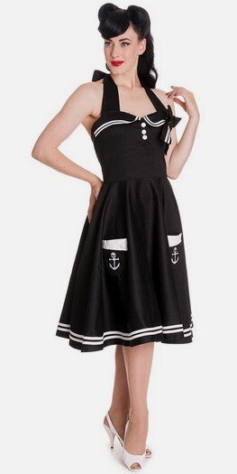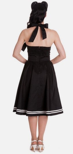 Vintage Neckholder Swingkleid, Petticoat geeignet. Das Motley Kleid ist schwarz oder mit weißen Kontrasten an Rocksaum, Kragen, Knöpfen und Taschen.