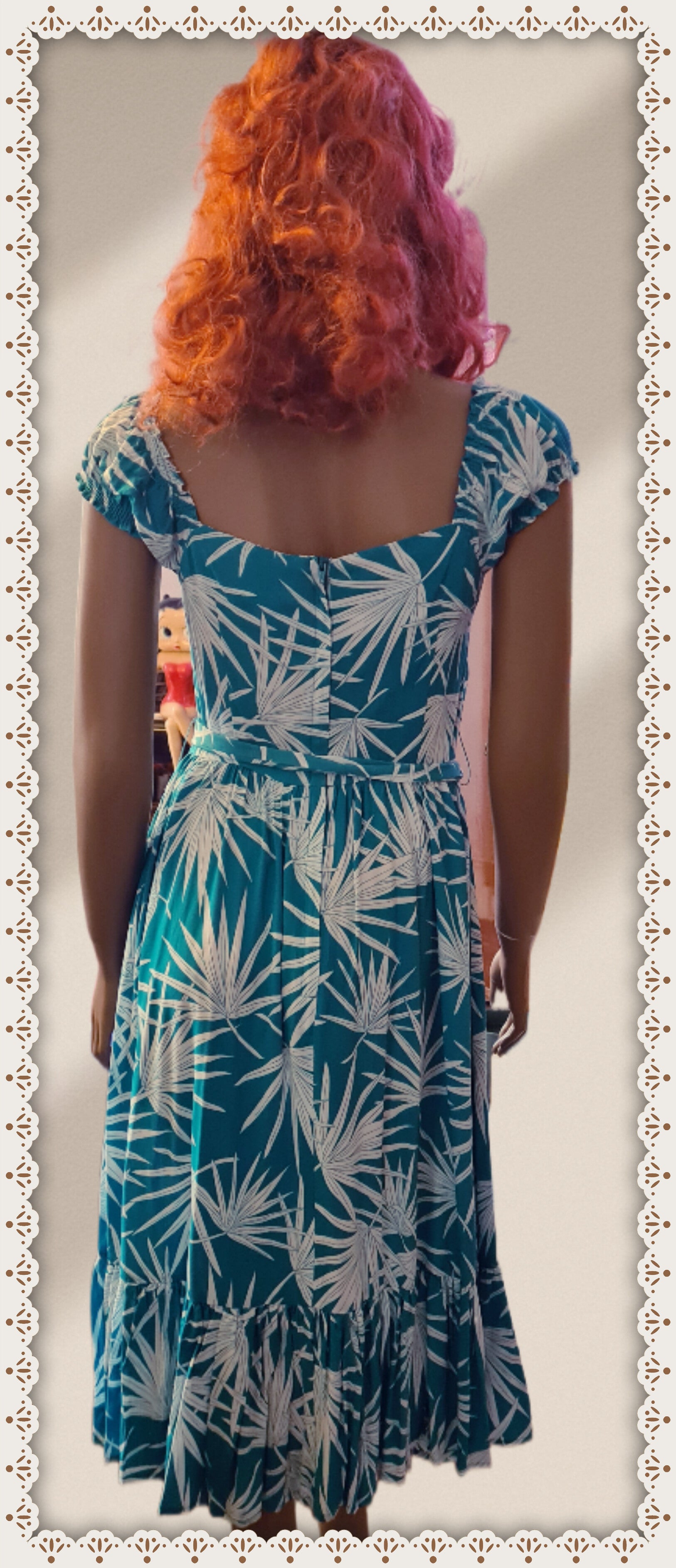 Leichtes Sommerkleid mit erstaunlichen Palmendruck und leuchtendem blaugrünen Hintergrund.