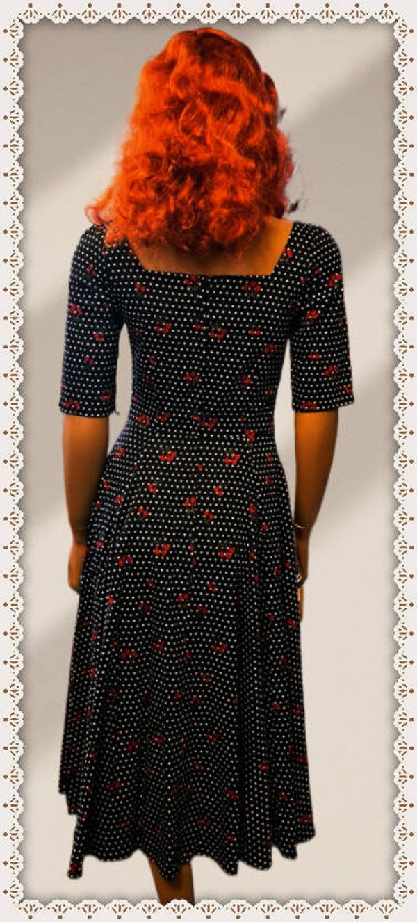 50er Retro Kleid in Schwarz mit kleinem weißen Polka Dots & Kirschen Print.