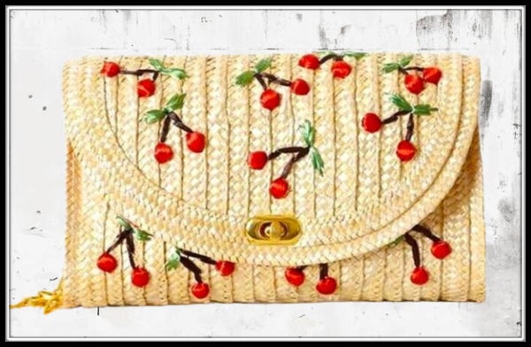 Retro Schultertasche von Collectif aus geflochtenem Stroh mit verspielten Raffia Kirschen all-over. Goldfarbener Drehverschluss und langer, goldfarbener Henkel. Tasche verfügt über ein großes Innenfach, mit kleinem extra Fach und ist vollständig gefüttert mit einem rot/weißen Karo-Stoff