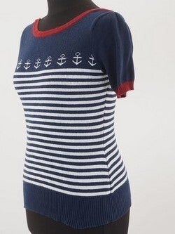 Rundhalsausschnitt, die leichten Puffärmel und das zweifarbige Ringel zuzüglich Anker Design überzeugen. Die Rippbündchen an Ausschnitt und Armsäumen sind uni in dunkelrot gehalten. Auf den Schultern je zwei Ankerknöpfe. Das gestreifte Strickshirt ist tailliert und etwas länger geschnitten.