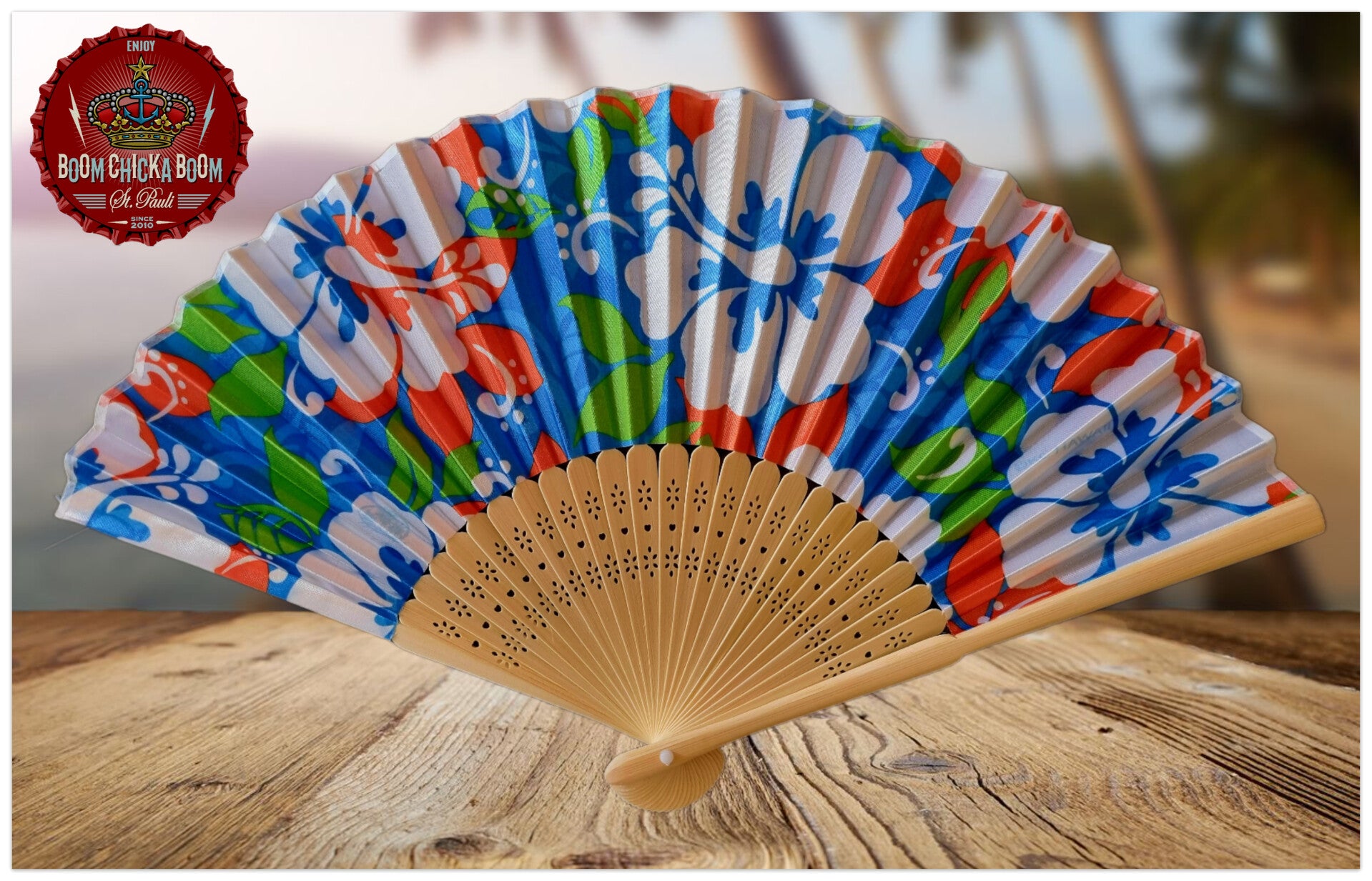 Der Fächer mit hawaiianischem Motiv sorgt für Abkühlung und ist ein ideales Accessoire im tropischen Südsee Stil. Einfach zusammenzuklappen und mitzunehmen.